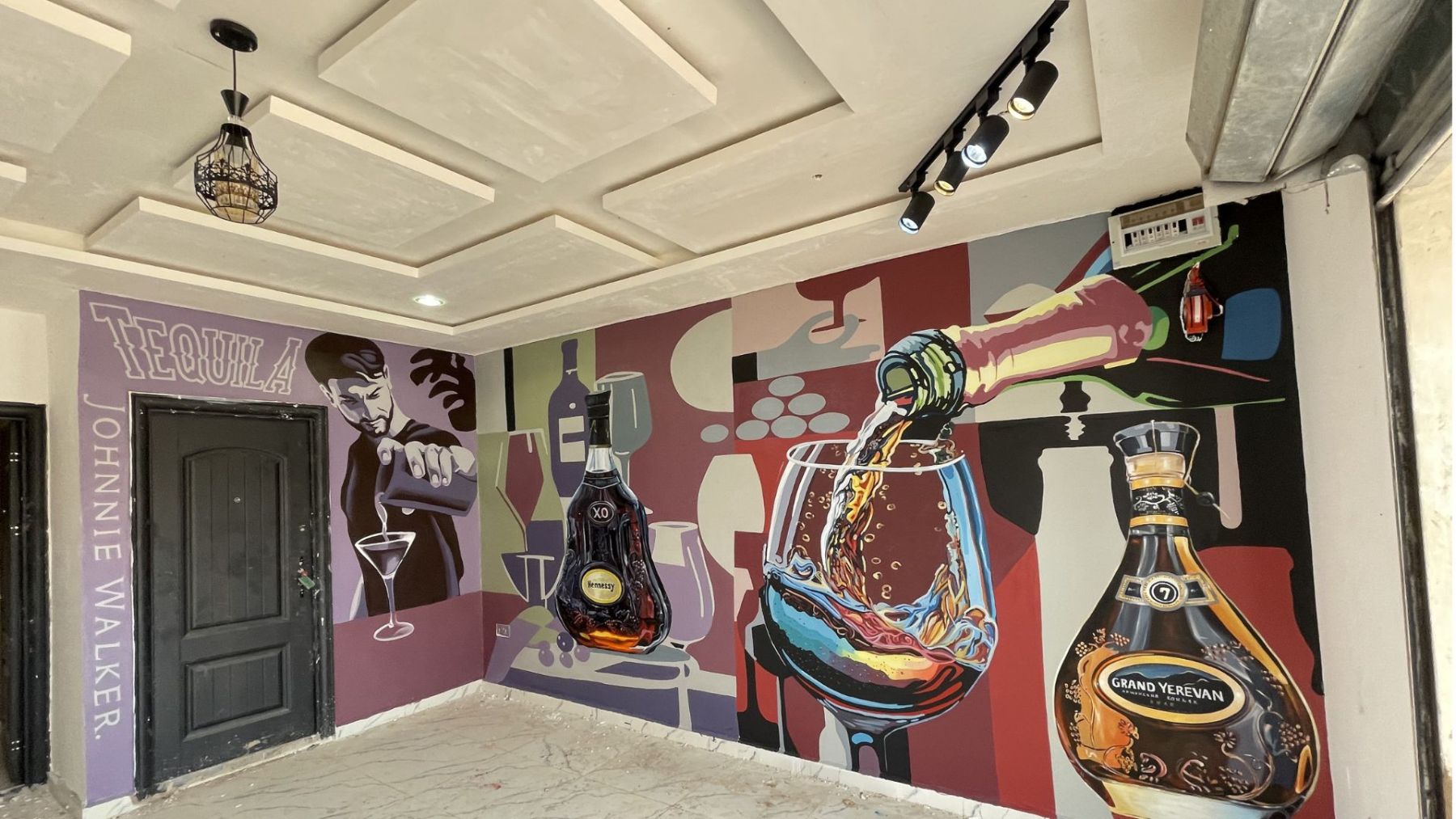 Indoor wall mural featuring vibrant, oversized illustrations of liquor bottles,